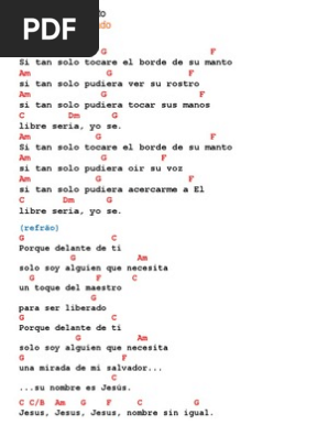 Por que delante de ti solo soy alguien que necesita un toque del maestro para ser liberado. 21 pues decía para sí: C am g f si tan solo tocare el borde de su manto am g f si tan solo pudiera ver su rostro am g f si tan solo pudiera tocar sus manos c dm g libre seria, yo se am g f si tan solo tocare el borde de su manto am g f si tan solo pudiera oir su voz am g f si tan solo pudiera acercarme a el c dm g libre seria, yo se g c porque delante de ti e am solo soy alguien que necesita g f c.